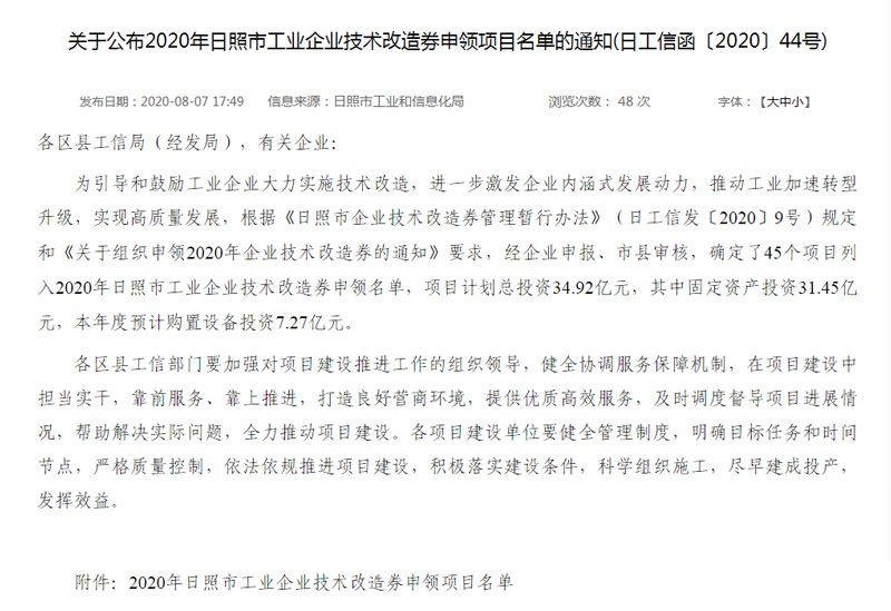 我公司成功申領2020年日照市工業企業技術改造券
