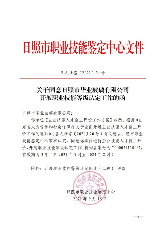 2021年9月15日,經日照市職業技能鑒定中心審核認定,同意我公司進行企業技能人才自主評價,開展職業技能等級認定工作。